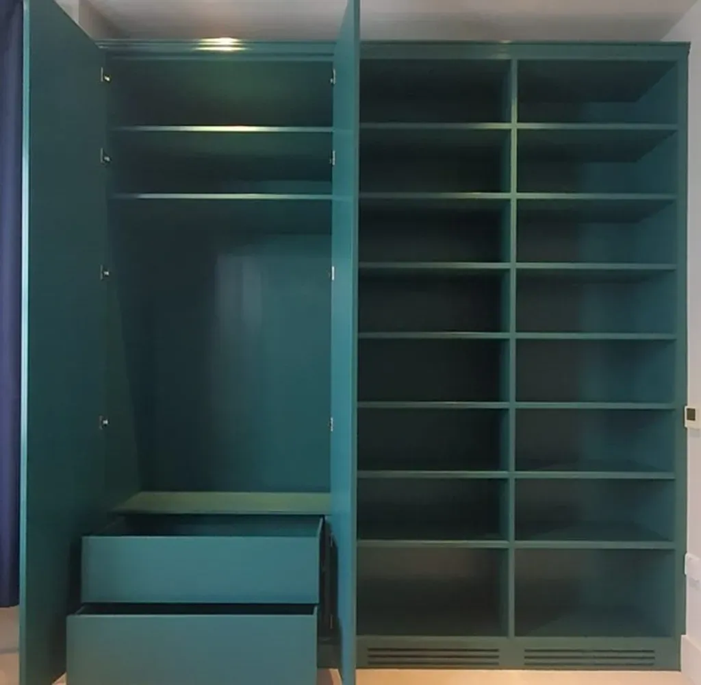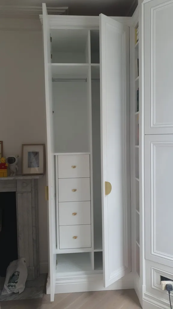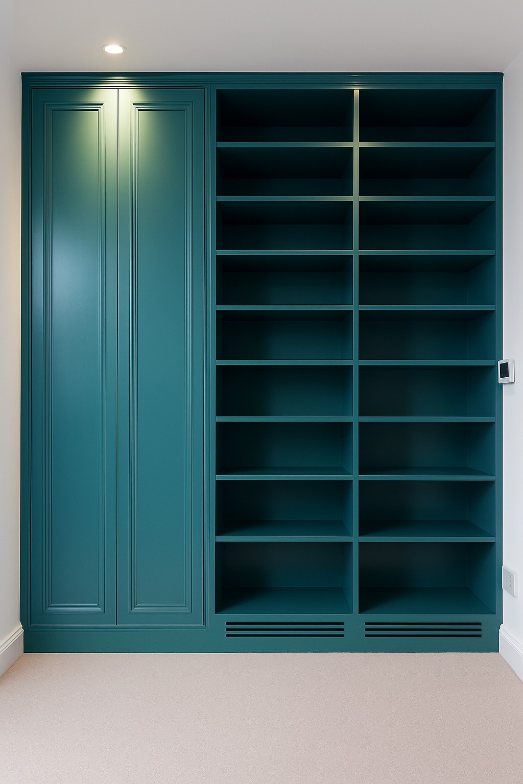 Inside, our wardrobes can be fully customized with adjustable shelving, hanging rails, pull-out shoe racks, jewellery drawers, and integrated lighting.